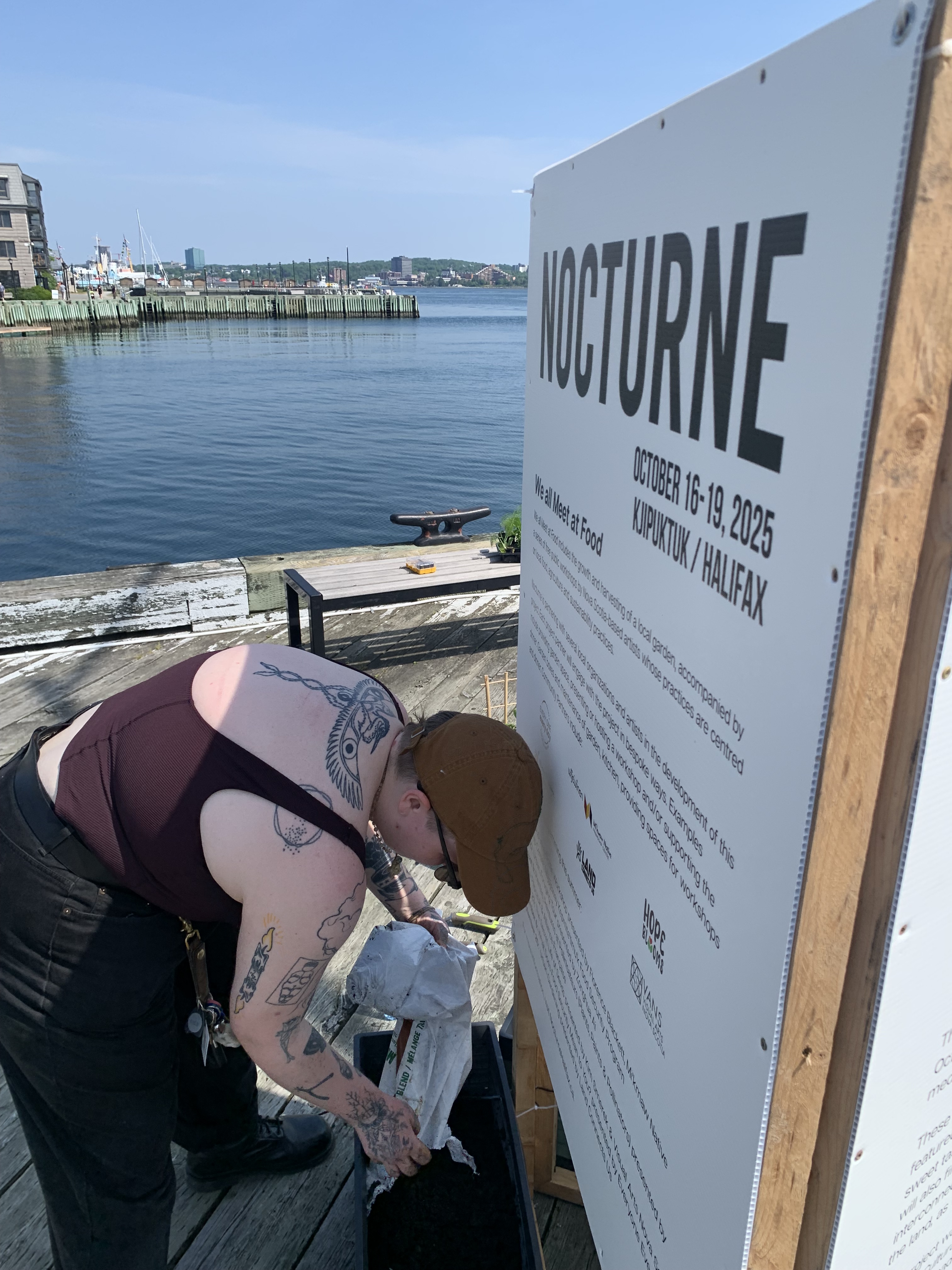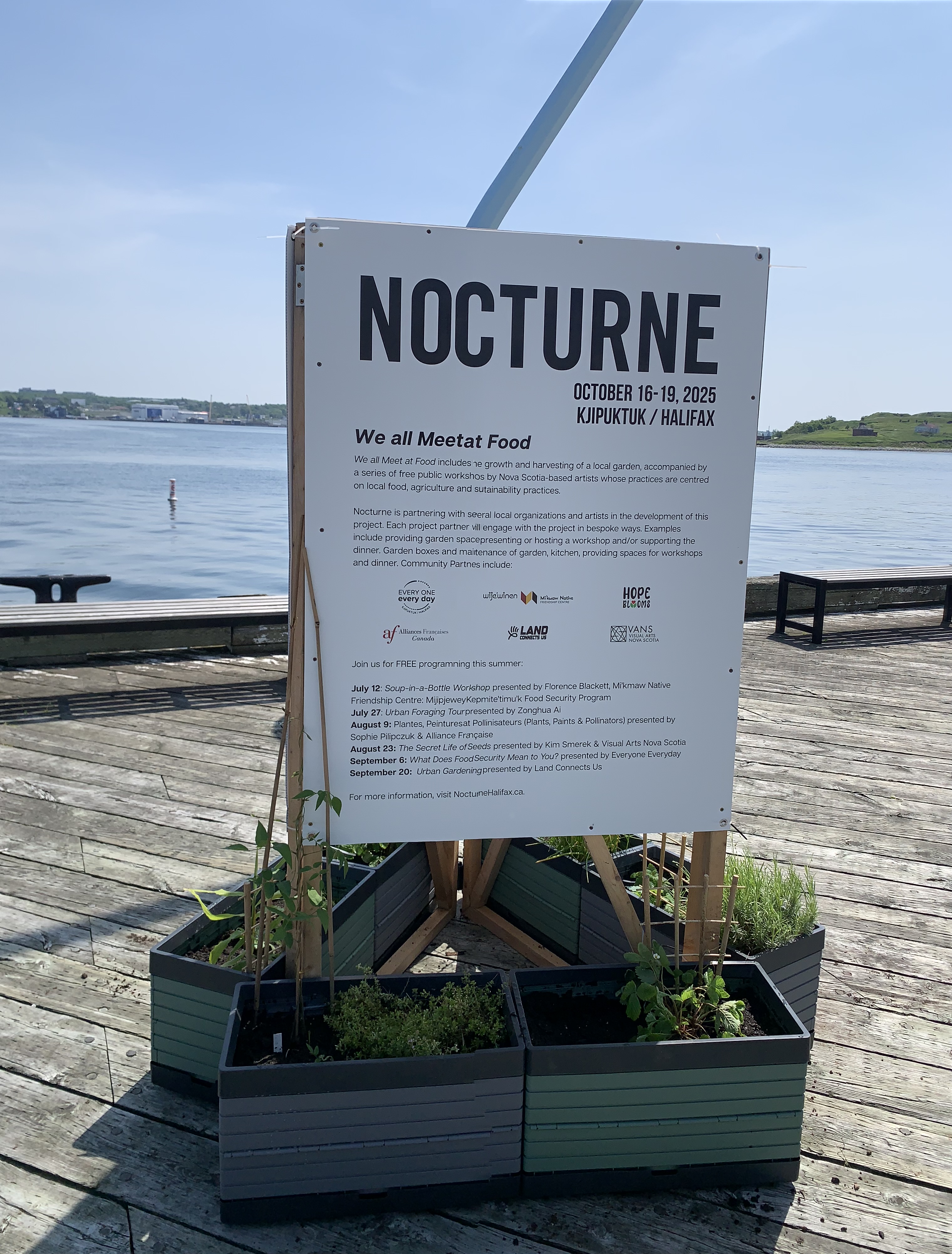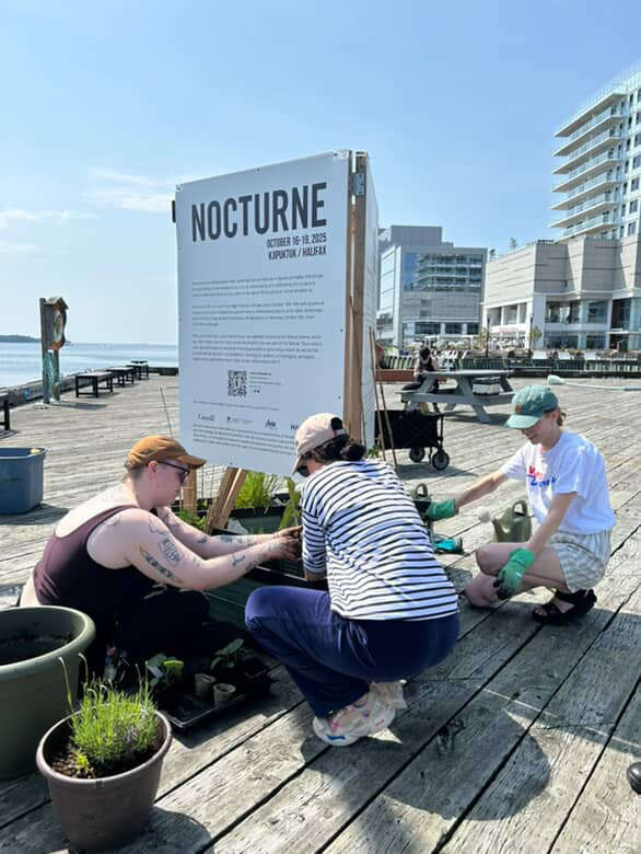 1. The Project: Installed on the Kjipuktuk/Halifax Waterfront, near the Helipad at Bishop’s Landing, the garden boxes will remain in place until the Nocturne Art-at-Night festival, October 16–19, 2025. These gardens are not only spaces of cultivation but also symbolic invitations to reconsider and redirect our relationship with places deeply marked by colonial history. (nocturnehalifax.ca)